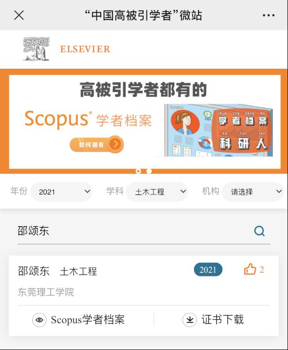 4月14日,2021爱思唯尔“中国高被引学者年度榜单”正式发布。该榜单以全球信息分析公司爱思唯尔的引文与索引数据库Scopus作为统计来源,从多个维度分析中国学者的科研成果表现。我校生态环境与建筑工程学院的邵颂东教授入选土木工程领域榜单。