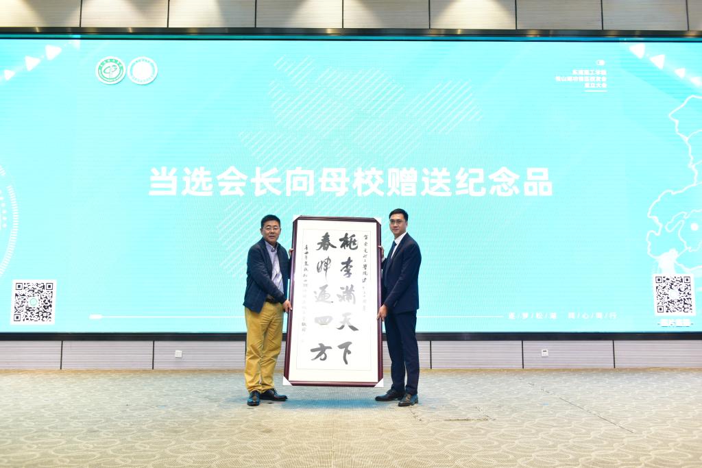 当选会长刘植河向母校赠送“桃李满天下 春晖遍四方”书法作品,祝福母校桃李满天下