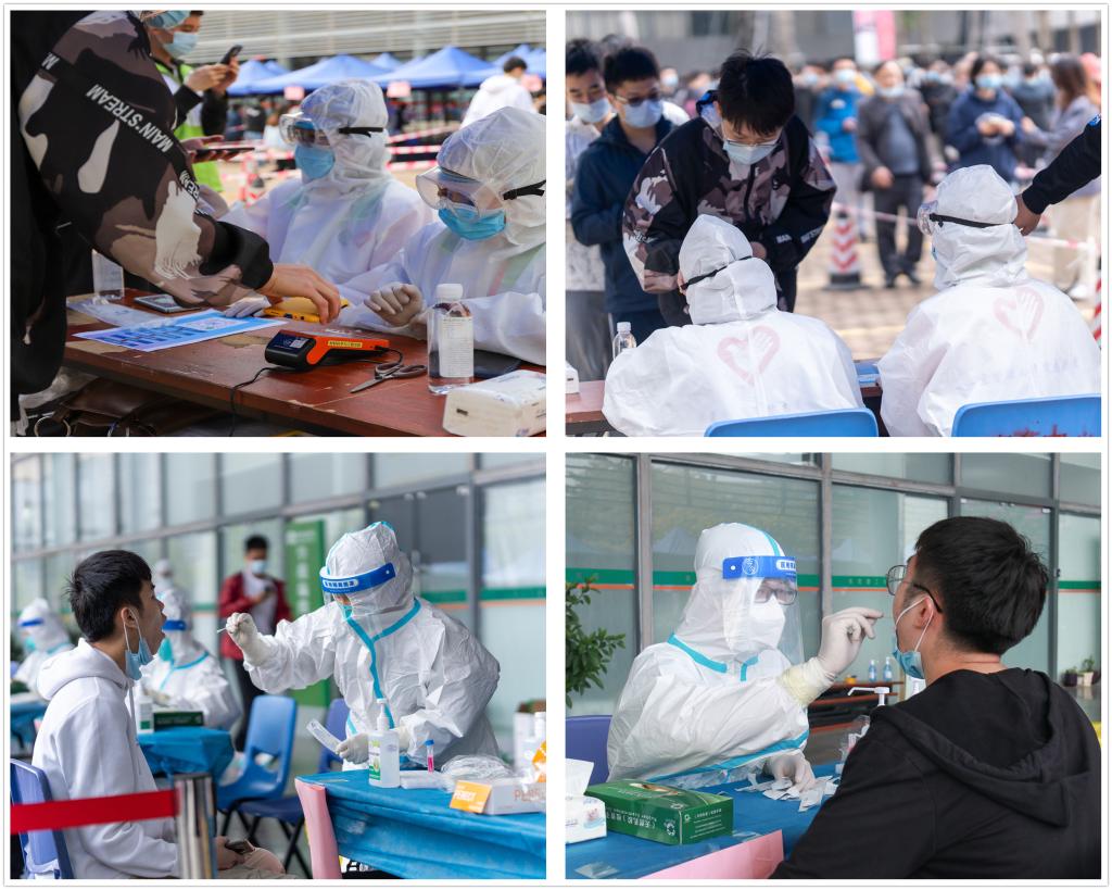 在核酸检测采样工作的现场,能看到许多身穿绿色马甲和红色马甲的志愿者,他们为师生测量体温、引导师生有序排队,为核酸检测工作的顺利进行提供坚实保障。