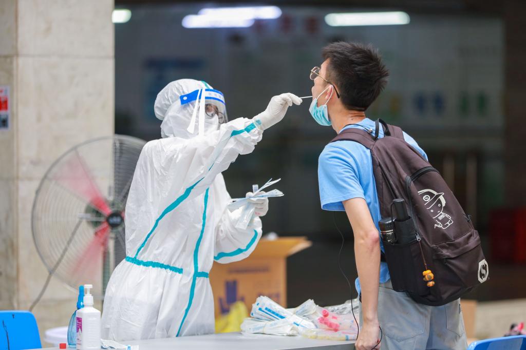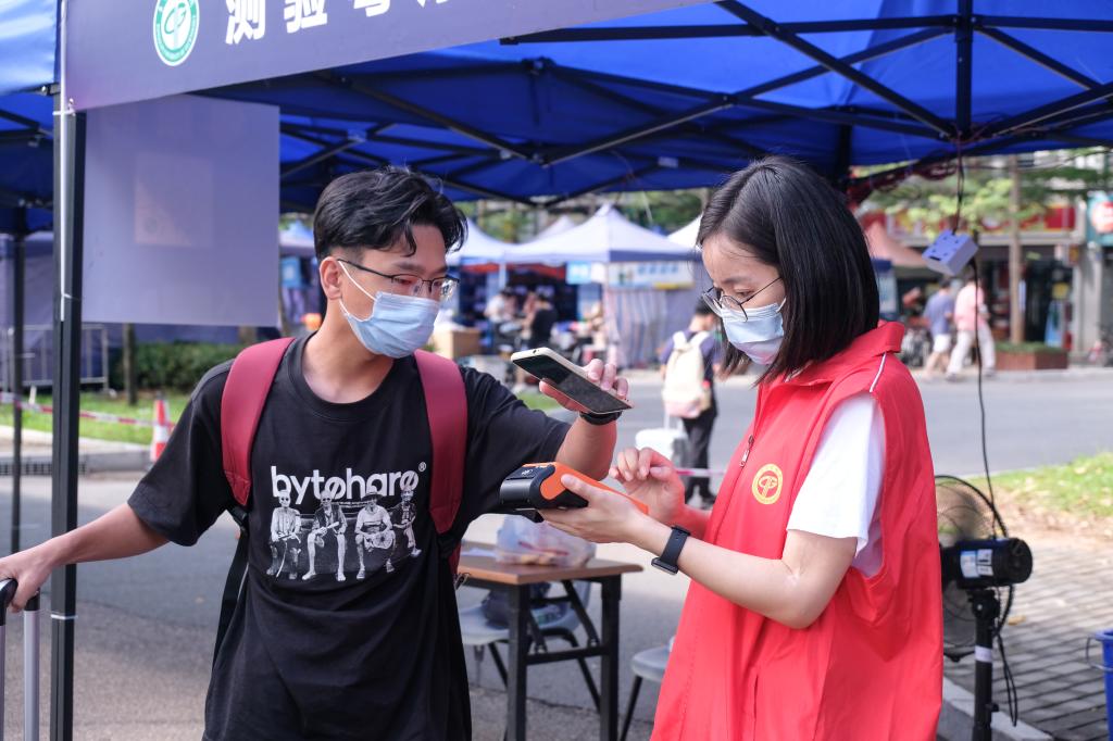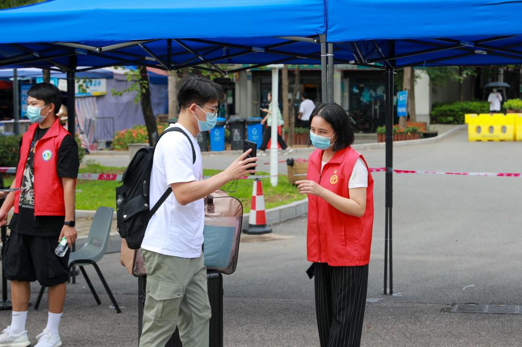 为预防新冠病毒进入社区,返校学生需要在指定地点做完核酸检测后才能进入社区。2018级教育学院的陈水婷是协助体育馆内核酸检测工作的一名志愿者,“我的任务主要是让同学们关注微信公众号,然后通过预约形成一个预约码,然后让同学们进入到测核酸的队伍,有序地排队。”在核酸检测过程中,志愿者们耐心地引导学生有序通过现场流程,为现场的安全与秩序增添了一份保障。