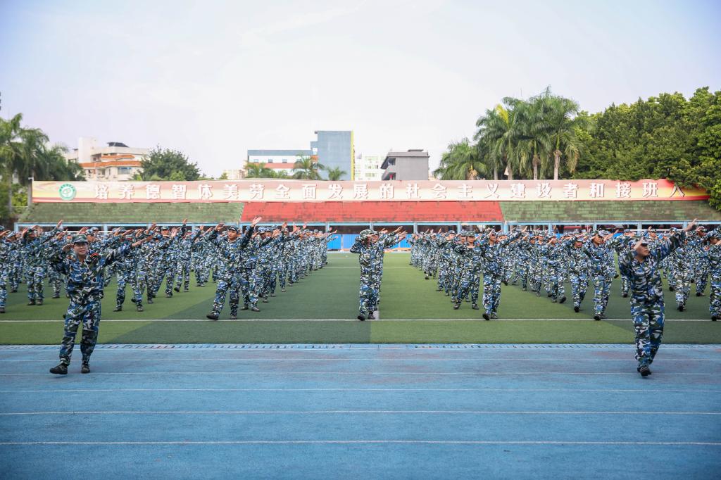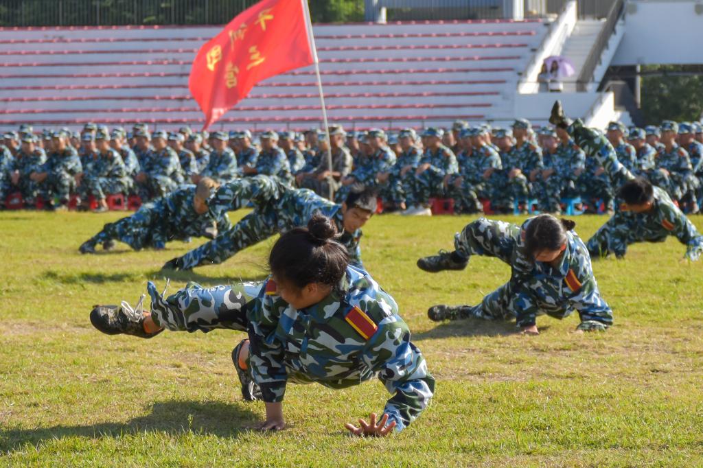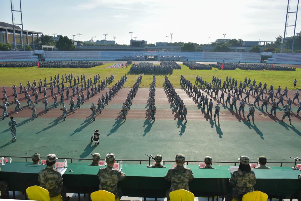 随后,伴随着响彻四方的呐喊声,2021级新生开始汇报表演,分列式、军体拳、匕首操、队列方阵表演、战术演练等项目尽显莞工学子豪迈气势和朝气蓬勃的青春风采。新生们拿出最饱满的精神,将这两周的训练成果展示出来;用最洪亮的声音,喊出青年人的精气神;用最有力的步伐,踩出精神抖擞的劲头。