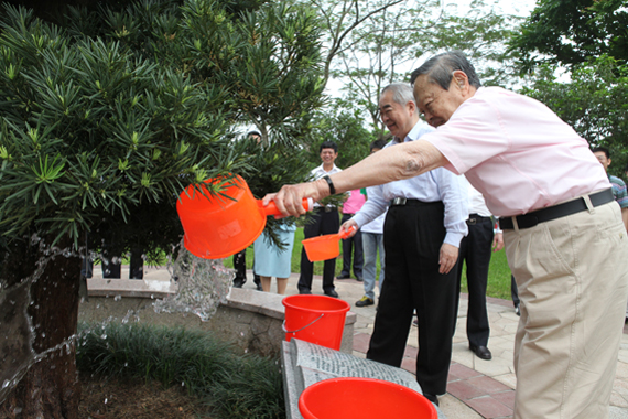 杨振宁博士、范曾大师一起为罗汉松浇水