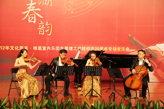 4月19日晚,我校20周年校庆专场音乐会“松湖春韵”在学术会议中心举行。东莞市文化周末·唯美室内乐团为观众奉上了一场高雅的艺术盛宴。学校领导周致纳、杨晓西、黄碧莲、吕琦元、安少华、邹晓平、戴炳源、李忠红,校党委委员李培经、杨敏林,东莞市部分老干部、学校退休老领导、老教授以及部分师生等聆听了音乐会。