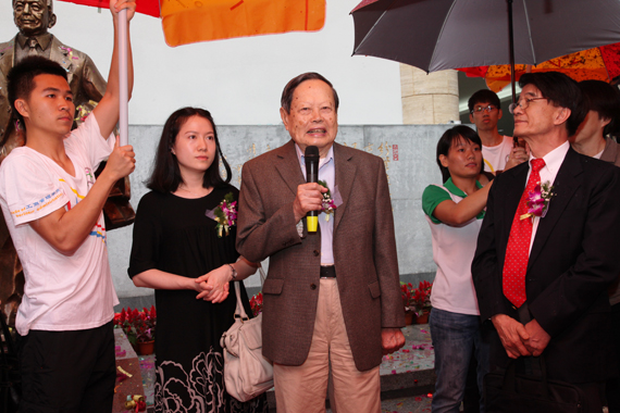 诺贝尔物理学奖获得者、我校名誉校长杨振宁博士及其夫人,著名学者、书画家、诗人范曾大师,香港科技大学原校长朱经武博士,中国著名雕塑大师、广东美术学院教授潘鹤夫妇,中国科学院院士陈和生研究员,我校领导周致纳、杨晓西、黄碧莲、安少华、邹晓平、戴炳源、李忠红,东莞市石龙镇党委书记黄贵洪等出席了陈省身、杨振宁铜像揭幕式。我校党委副书记吕琦元主持揭幕仪式。