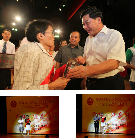 5月3日下午,我校举行首届“莞工之星”颁奖礼。林火荣、黄启珊、姜兰、邱萧寒,“新生代农民工利益诉求调查报告——东莞个案”挑战杯团队共5名同学或集体获得“莞工之星”称号;王材汉、吴少涛、黄凰、李安琪,45612藏宝阁资料女子篮球队共5名同学或集体获得“莞工之星提名奖”。