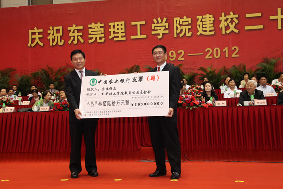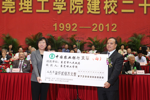 东莞市政府给我校安排了“学科、硕士点建设专项经费”7200万元,用以全力支持学校上水平、上层次。东莞市副市长喻丽君代表市政府向我校代表、校党委副书记吕琦元递交了支票。这笔专项经费为我校注入了强劲的发展动力。