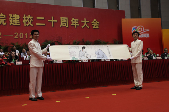 当日,当代著名学者、书画家、诗人范曾大师不仅拨冗莅临我校参加建校20周年庆祝大会,还向我校赠送了题为《陈省身与杨振宁》的书画,令我校蓬荜生辉。学校志愿者上台展示了书画。