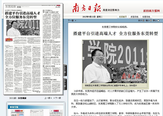 9月11日,《南方日报》在“智谋东莞”栏目关注我校服务东莞转型发展。文章从“社会服务、成果转化、人才引进、校企合作、教育改革”五个方面报道了我校如何发挥优势创新发展,服务东莞双转型,助推东莞高水平崛起。