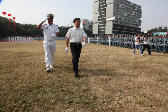 成洪波书记在军训团团长毛广裕的陪同下检阅受训新生