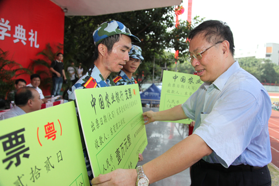 军训汇报表演后举行了开学典礼。成洪波、杨晓西分别为9名同学颁发了新生奖学金。其中,来自东莞的林晓君获得4万元新生奖学金,分四年发放,每年1万元;其他8位来自省外的同学获得1万元的新生奖学金。