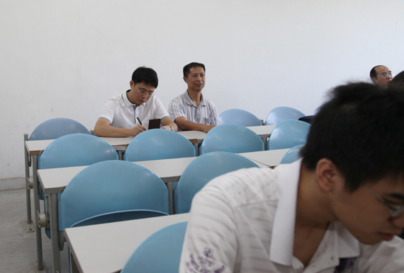 上午10时25分,电子工程学院的同学正在 6D201课室上英语课。成洪波一行走了进去,安静地坐在最后一排座位认真地听课,并不时做记录。