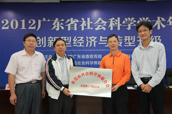 广东省社科联专职副主席林有能、东莞市社会科学界联合会主席王思煜向我校副校长李忠红授牌。