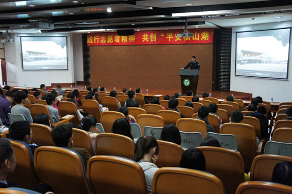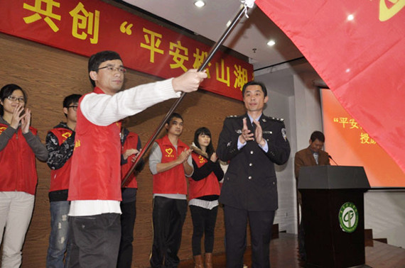 讲座前举行了“平安松山湖”志愿服务队授旗仪式。松山湖公安分局副局长陈始向志愿者代表授旗,并希望更多同学加入到志愿者队伍当中,共建平安校园、平安东莞。