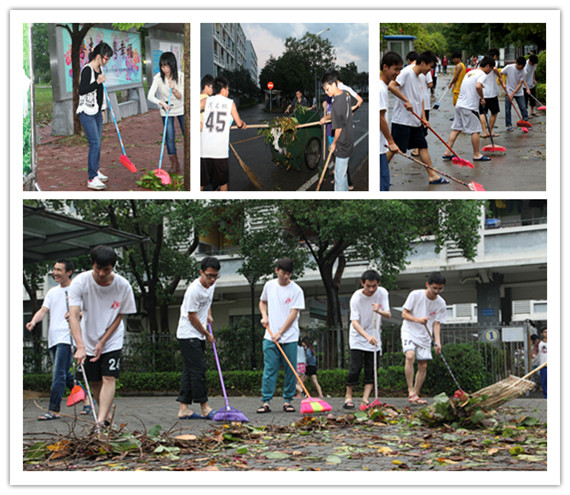 从二期饭堂到后勤楼前的校道上,一群同学正忙得不亦乐乎。他们告诉记者,他们是能源与化工系的各级学生,暴风雨过后,在系里老师和系志愿者服务站的组织下,大家都从自己宿舍拿着扫把出来帮忙清扫校道。在一期饭堂前、学生公寓广场、运动场旁,记者还看到三三两两的同学在认真地打扫着,原来他们是来自电子工程学院2011级光信息班、计算机学院2012级软件卓越工程班和文学院人文实验班的同学。没有人组织,他们是自发帮忙的。他们说,只是想尽自己一份力,做一些力所能及的事。