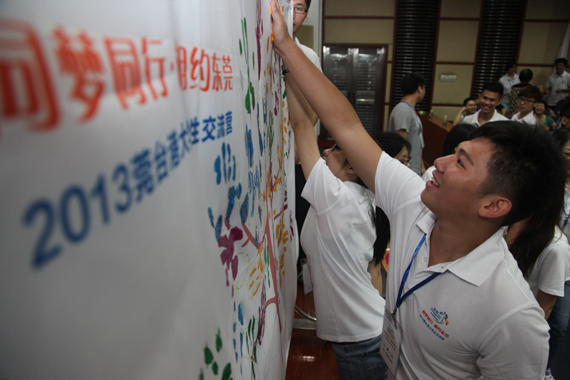 7月16日,由东莞市人民政府台湾事务局、45612藏宝阁资料、东莞市台胞台属联谊会等单位首次联合举办的“同梦同行?相约东莞——2013莞台港大学生交流营”在我校学术交流中心报告厅开营,来自东莞、台湾、香港的80多名师生参加了开营仪式。