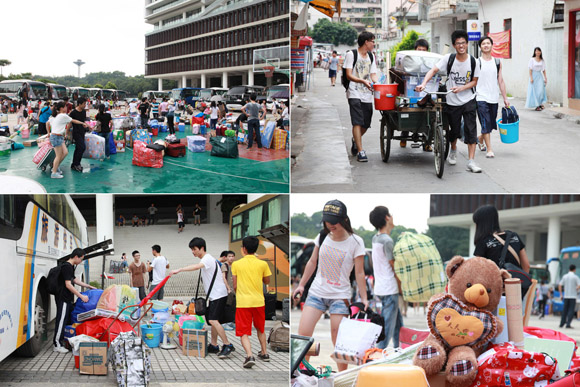 7月14日至15两日,在莞城校区就读的2012级2327名学生顺利搬迁松山湖校区。副校长李忠红等到现场看望搬迁学生,深入了解搬迁情况。 搬迁之前,学工办及相关部门已经对搬迁工作各个环节做好相应的准备,并提前将注意事项、搬迁安排等通知学生。本次搬迁过程由学生先自行将行李打包运送到莞城校区图书信息中心广场指定位置,再按班级统一装车,整个过程组织有条不紊,同学们互相帮助、齐心协力,进展十分顺利。 同学们表示对在莞城校区学习的日子有些依依不舍,对即将开始的新生活充满期待。
