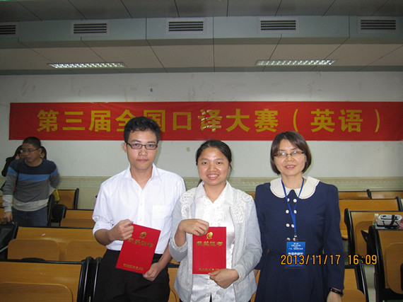 11月17日,由中国翻译协会和中国对外翻译出版公司共同主办的第三届全国口译大赛广东、海南赛区复赛在广东外语外贸大学高级翻译学院举行。外语系口译比赛指导教师陈玉珍带领我校曾获校级口译比赛一等奖的何惠余(外语系)和李国豪(电子计算机学院)两位学生参加了这次口译大赛。