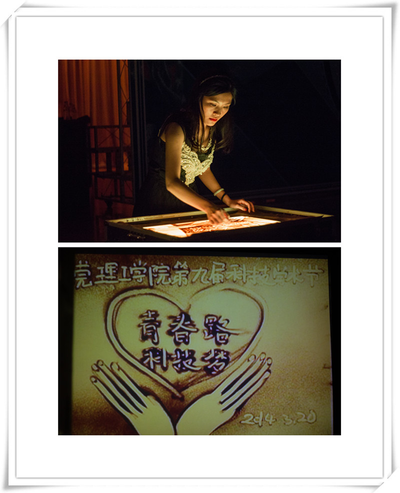 在今年的科技学术节开幕式上,特别融入了沙画艺术表演,展示科技魅力,打造同学们喜爱的科技盛宴。沙画表演以本届科技学术节的主题“青春路,科技梦”为中心,巧妙运用沙子勾画出校门、校训石、图书馆、科技学术节节徽、莞工青年杯等莞工元素,并对上一届科技学术节活动进行了简单回顾。