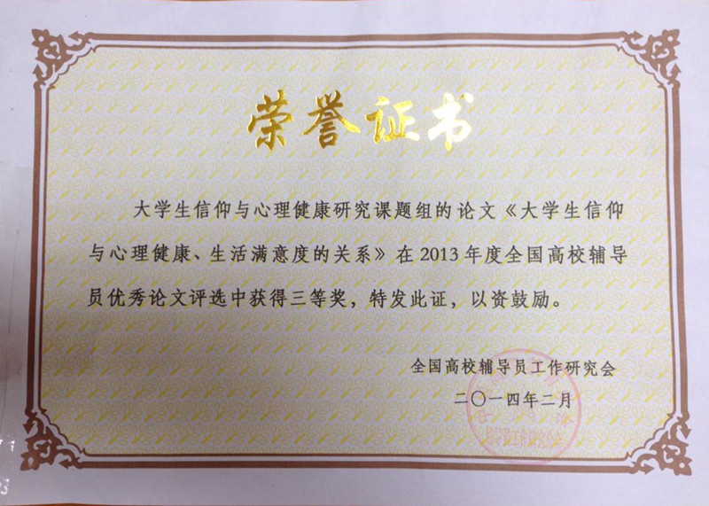 日前,由教育部思想政治工作司指导、全国高校辅导员工作研究会主办的2013年度全国高校辅导员工作优秀论文评选的结果正式揭晓。我校学生处“大学生信仰与心理健康研究”课题组撰写的《大学生信仰与心理健康、生活满意度的关系》一文荣获三等奖。