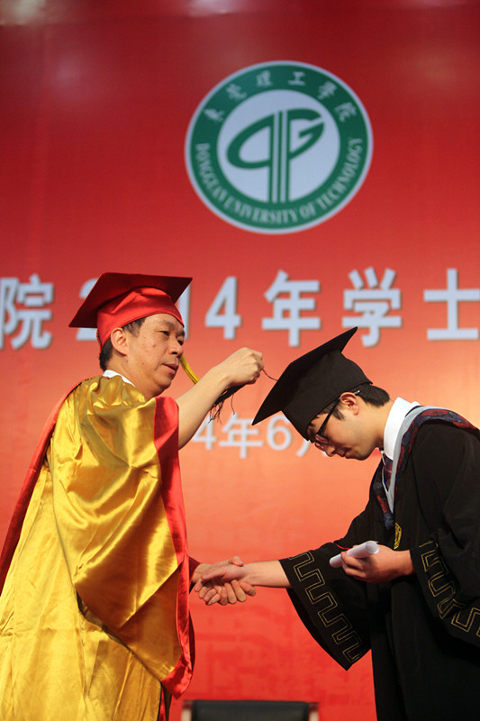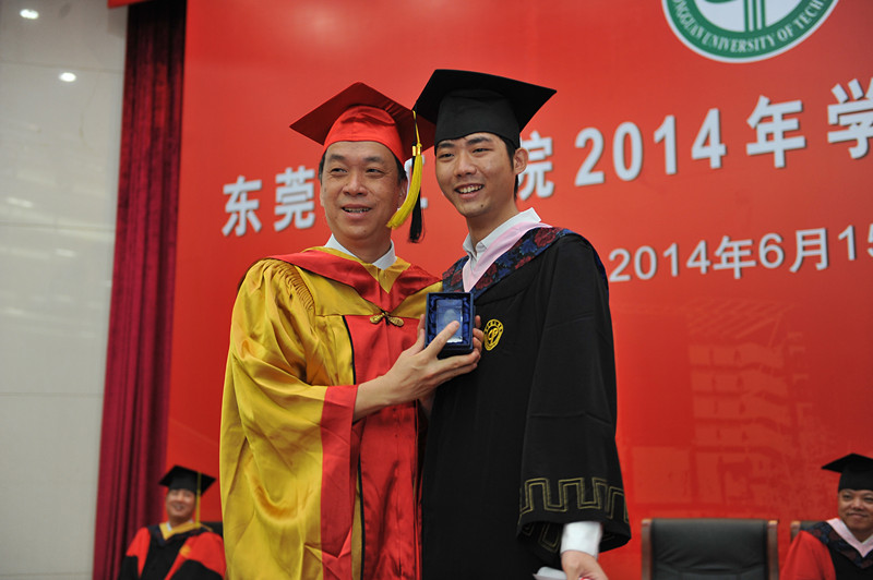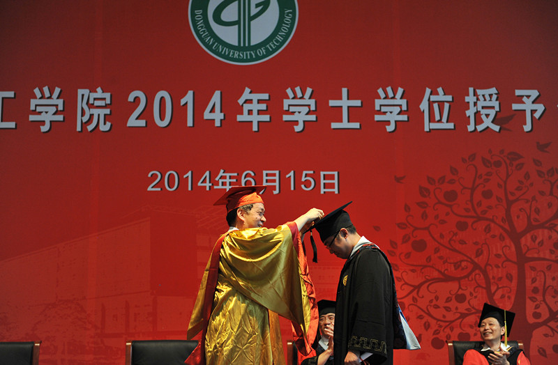 6月15日和16日,毕业典礼之后,我校在松山湖校区会议中心举行2014届毕业生学士学位授予仪式。与去年一样,李琳校长亲手为毕业生一一扶苏正冠。2985名毕业生依次走上主席台,等待也许是四年中与校长唯一一次的亲密接触。
