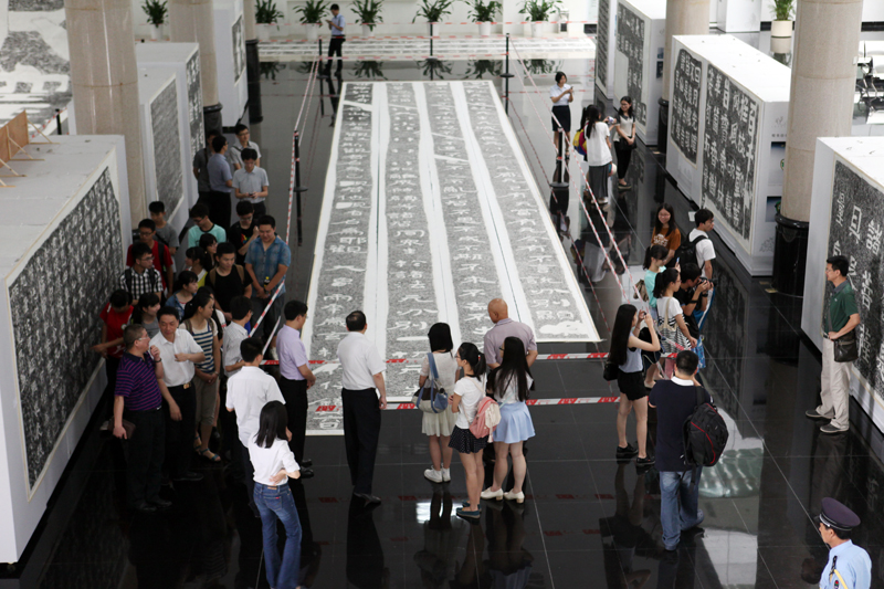 据介绍,本次展出的藏品共有50余件,均为摩崖石刻原拓片,石刻作品年代多为汉、六朝等,展出规模宏大,在国内尚属首次。在展出的藏品中,最大型的藏品达到尺幅宽2.48米、长15米;北齐刻石长卷10幅最长达22米。在本次展出的藏品中,有很多藏品具有非常高的艺术价值和历史文献收藏价值,如汉代的“石门颂”、“西峡颂”等,被誉为汉隶的最为代表性的作品。魏朝的“郑文公碑”字体洒脱,气势舒展,为不可多得的汉隶典范之作。而北齐的石经刻石系列,字体素朴典雅,境象阔大,有超脱凡俗的艺术追求。