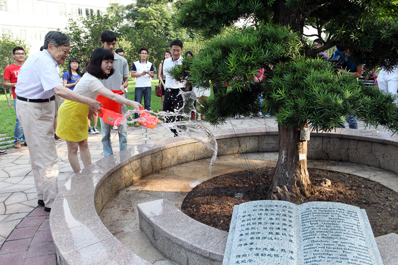 在师生们热烈的掌声中,杨振宁博士伉俪兴致勃勃地走到这棵罗汉松前,一同为罗汉松施肥浇水。虽已是92岁高龄,但杨振宁博士依然步履矫健、精神矍铄。杨振宁博士说道,上一次见到该树是2012年,如今已是青葱翠绿,长高了不少。这也是杨振宁博士第五次来到我校,指导我校的建设发展。