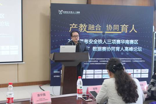 与此同时,当日下午,在学术会议中心举行了2016年信息安全铁人三项赛华南赛区“昆仑卓越杯”数据赛协同育人高峰论坛,计算机与网络安全学院院长袁华强教授在会上作了重要报告。他就计算机与网络安全学院如何培养信息安全人才、如何与企业联合做到产教融合和协同育人等方面进行了详细阐述。
