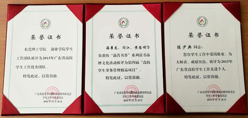 我校荣获三项奖励,其中文学与传媒学院辅导员海景龙负责的“菡萏书香”系列读书品牌文化活动获评为第四届“高校学生事务管理精品项目”,创业学院学生工作团队获评为2015年广东省高校学生工作优秀团队,经济管理学院辅导员陈少典获评“2015年广东省高校学生工作先进个人”。