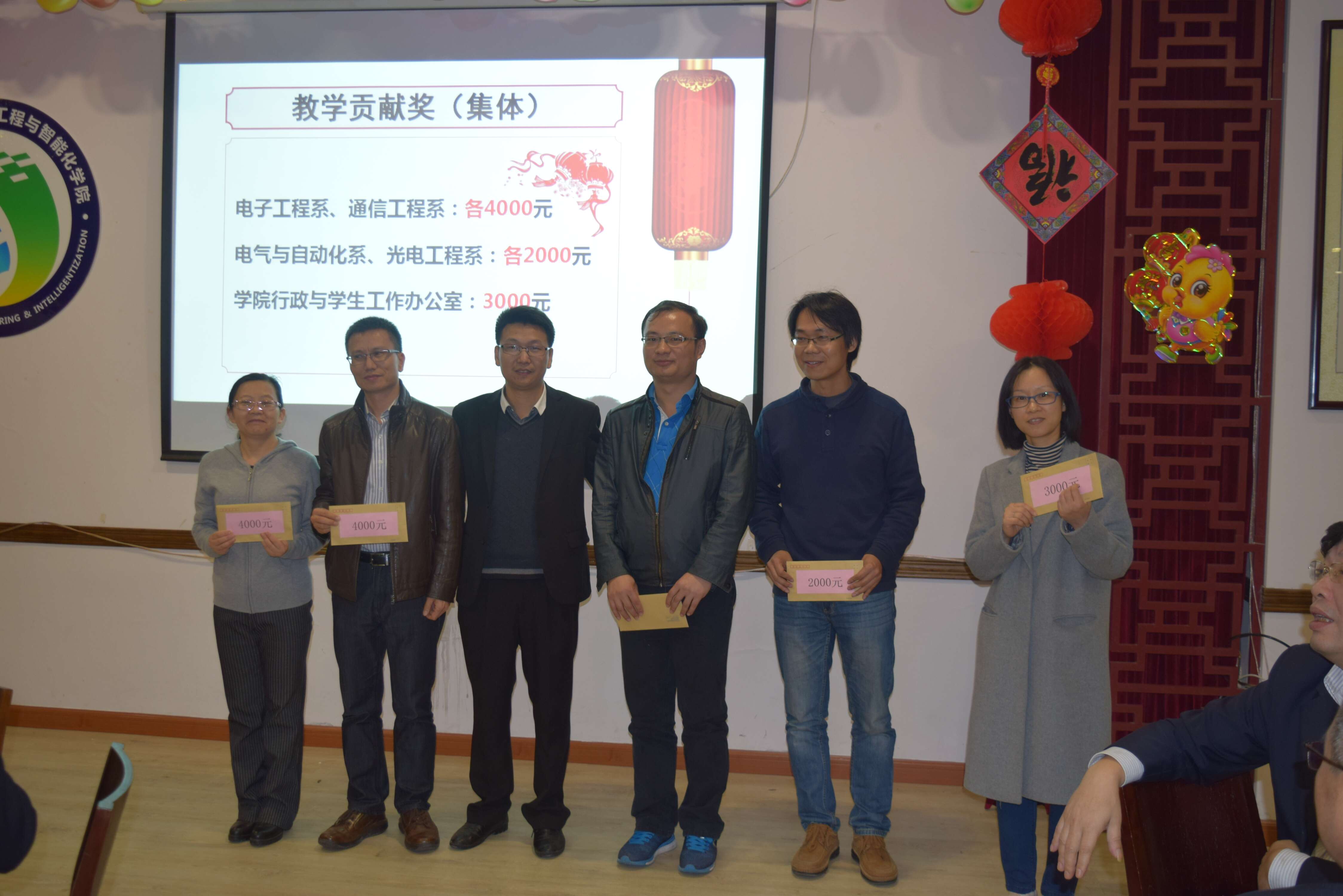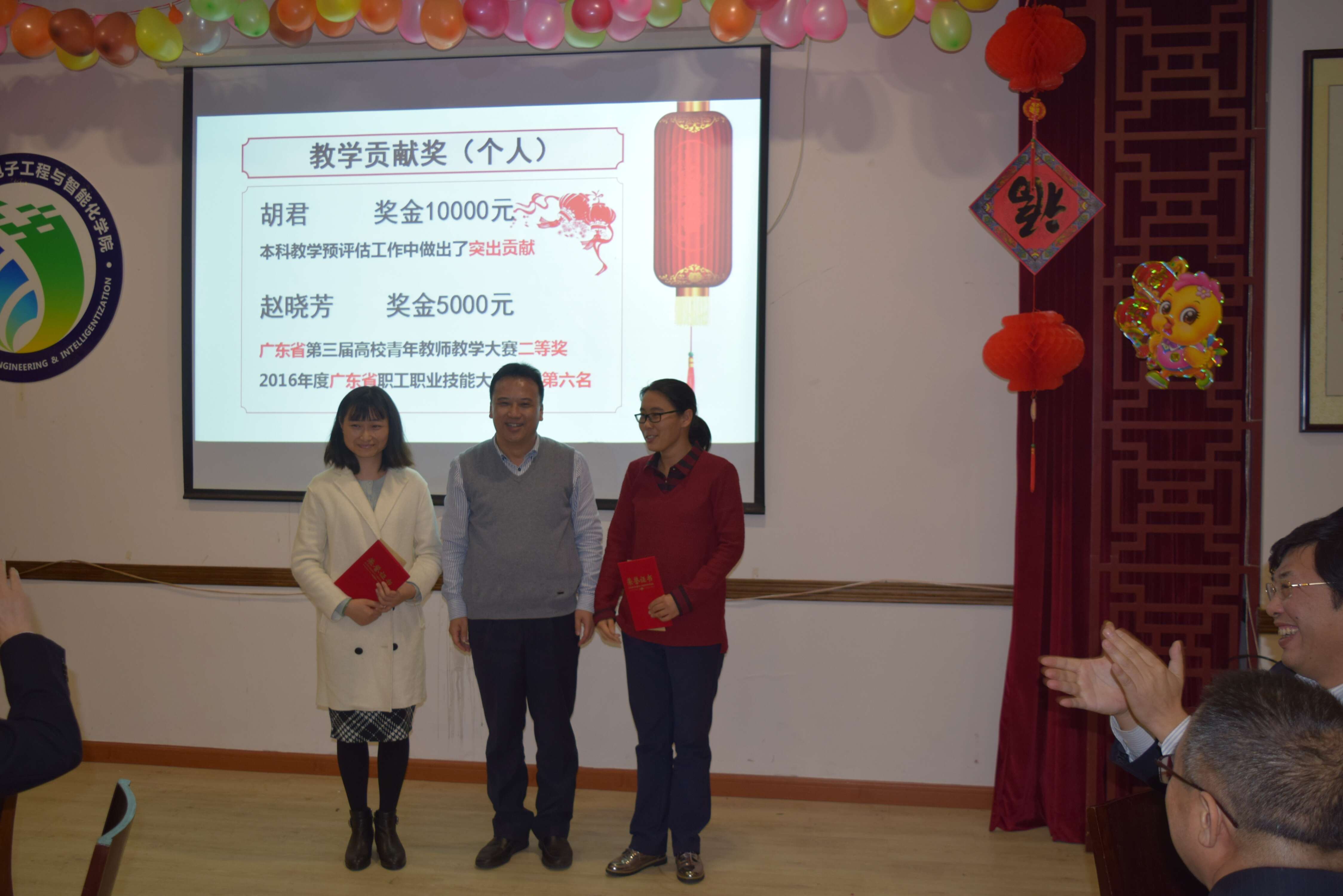 “广东长盈”教学集体贡献奖授予了在2016年本科教学预评估工作中做出了重要贡献的电子工程系、通信工程系、电气与自动化系、光电工程系、学院行政与学生工作办公室等5个集体,广东长盈精密技术有限公司总经理助理罗卫强为获奖集体颁发了奖金。
