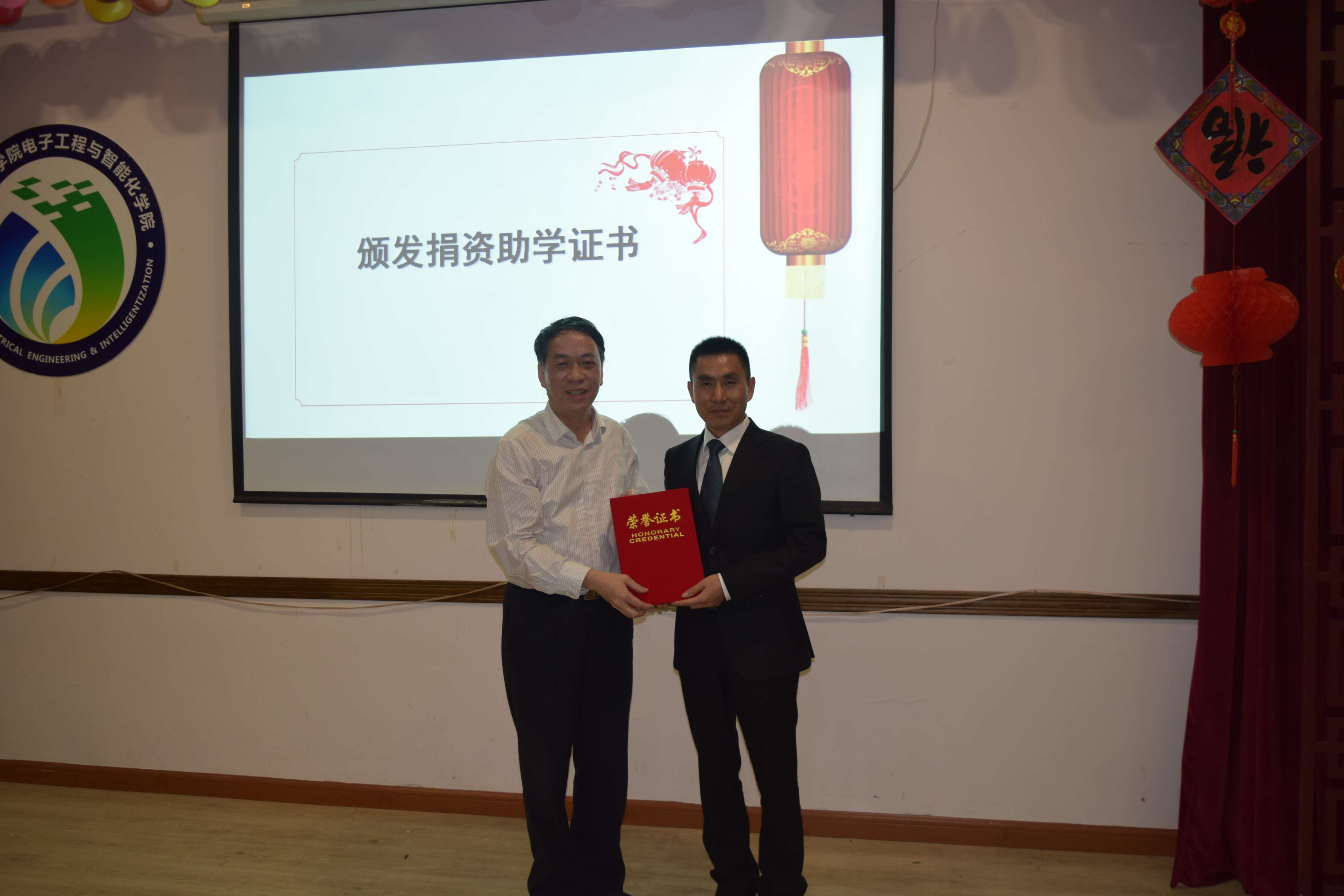 广东长盈精密技术有限公司长期关心支持电智学院教育事业的发展。2016年,广东长盈决定在学院设立每年10万元的奖教金和10万元的奖学金,以激励该院学生刻苦学习、奋发向上、全面发展;鼓励该院教师不断提升业务素养、投身高素质应用型创新人才的培养。“广东长盈奖教金”设科研贡献奖、教学贡献奖和实验贡献奖3个奖项。为了表达对广东长盈精密技术有限公司捐资助学、热心公益的感激之情,李琳向任项生总经理颁发了捐资助学证书。