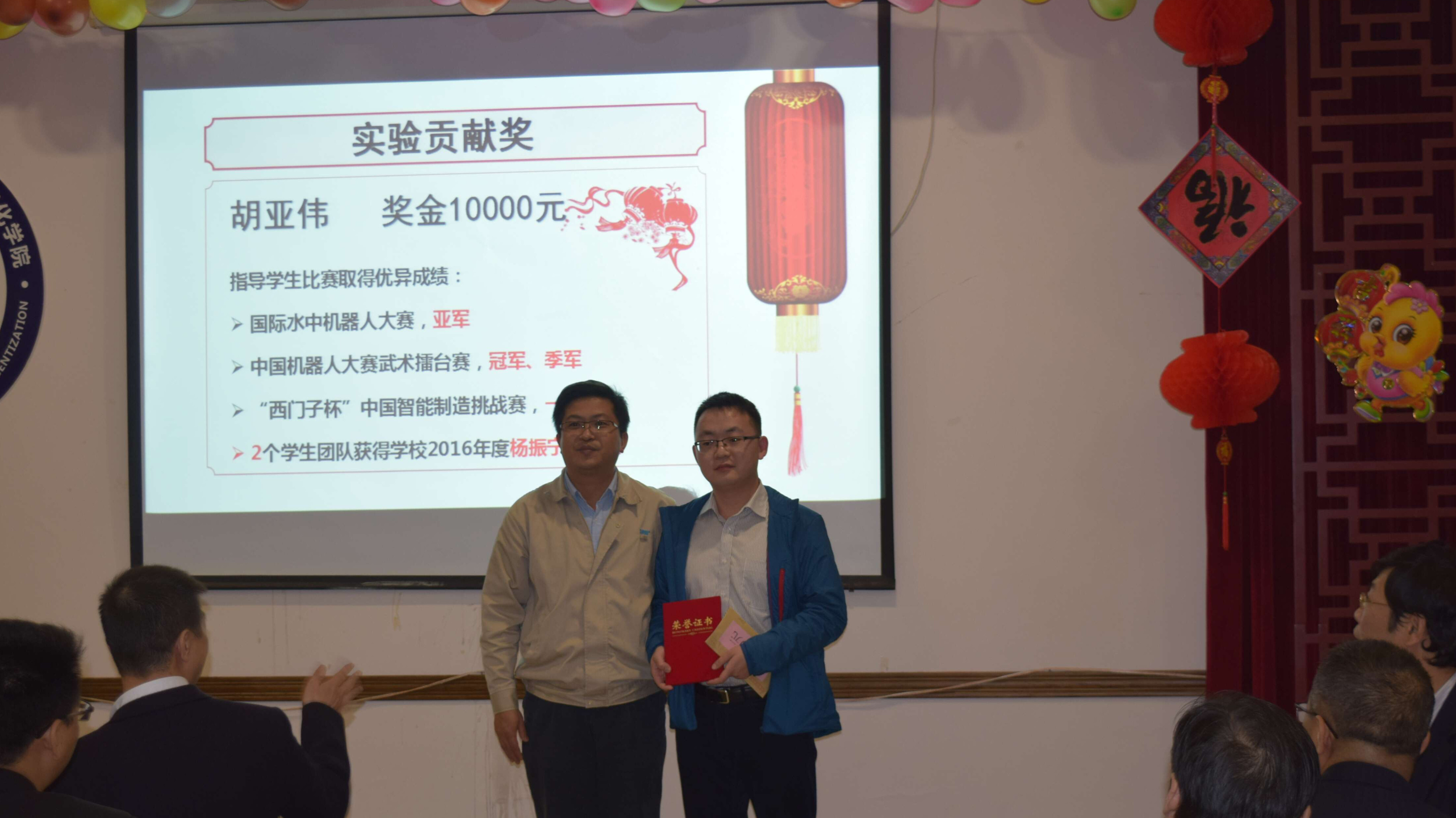 “广东长盈”实验贡献奖授予了在2016年度指导学生在学科竞赛方面取得了优异成绩的实验员胡亚伟老师,广东长盈精密技术有限公司人力资源部何永浩经理为胡亚伟老师颁发了奖金和证书。