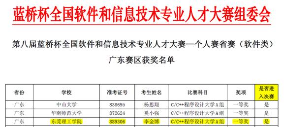 近日,从组委会传来喜讯:此次参赛的计算机与网络安全学院学子们表现优异,一共获得79项奖项,其中一等奖9项(同时获得参加国家级决赛的资格),二等奖22项,三等奖48项。特别值得欣喜的是,学院2016级学生李金博、2014级学生黄益辉勇于挑战,分别参加了主要面向中山大学、华南师范大学等985/211高校学生的C/C++程序设计、JAVA软件开发大学A组比赛,并双双获得全省一等奖的好成绩。