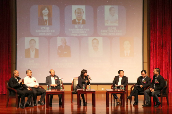 论坛最后环节,中国印刷科学技术研究院副院长总工程师欧阳芸、裕同研究院院长陈广学、我校环建学院副院长邱永福、鸿铭智能股份董事长金健、冠力胶业总工程师卢智、贵联集团金诗天新型包装总经理贺全敏、东方红印刷公司总经理方海祥7位嘉宾汇聚一堂,就印刷包装行业的发展趋势及各自所在单位如何做到绿色、环保、高效、安全等内容展开对话。