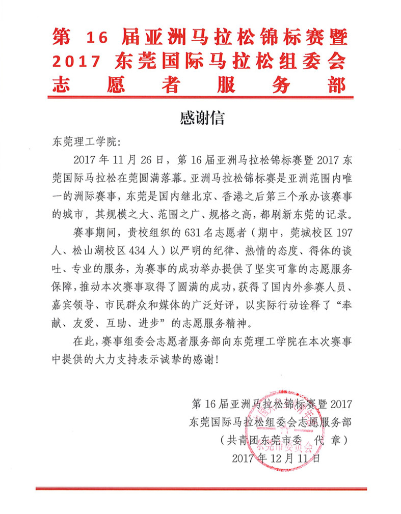 12月12日,学校收到一封来自第16届亚洲马拉松锦标赛暨2017东莞国际马拉松(简称亚马&莞马)组委会志愿服务部的感谢信,对我校亚马&莞马志愿者在赛事期间提供了坚实可靠的志愿服务保障表示诚挚的感谢。