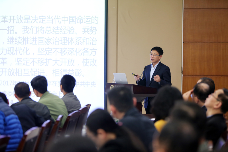 4月17日上午,在校党委中心组(扩大)学习会上,校党委书记成洪波围绕深入学习贯彻习近平总书记重要讲话精神,以“当好改革开放的开拓者实干家”为题,为学校领导班子成员和部分中层干部上专题党课。成洪波强调,学校发展进入新阶段,要担当历史使命,抢抓历史机遇,全面深化体制机制改革,构建全方位开放合作格局,以更高效率的改革和更高层次的开放,加快推进学校治理体系和治理能力现代化,努力开创高水平理工科大学建设新局面。