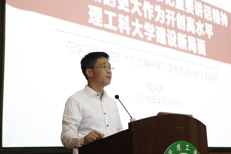 4月27日,在我校学习贯彻党的十九大精神第三期专题培训班上,成洪波以“学深悟透习近平总书记重要讲话精神 以新的更大作为开创高水平理工科大学建设新局面”为主题作开班动员主题报告。全体校领导、中层干部、系主任、科级干部、辅导员等参加学习。
