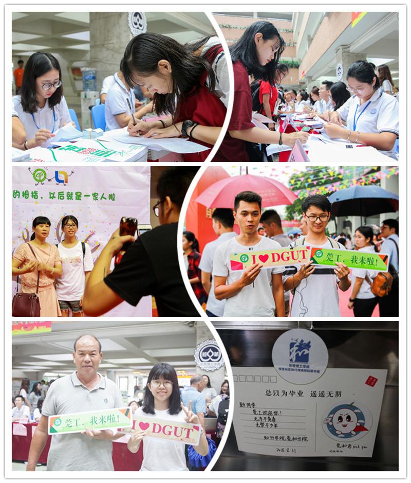 迎新现场,不少学院也别具匠心。计算机与网络安全学院为每位前来报到的新生赠送一个印有学院名称的手环和一张院徽贴纸,为了鼓励新生参与学院为新生开展的各项活动,学院还精心设计了“有奖游戏”。新生只要参与相关的活动,就会获得一张贴纸,收集齐9个图案不一的贴纸,就会获得一份小礼品。文学与传媒学院则设置了一面彩绘墙,图案由学院的老师、新生和家长的指纹印共同绘就,寓意“齐聚莞工,逐梦未来”。