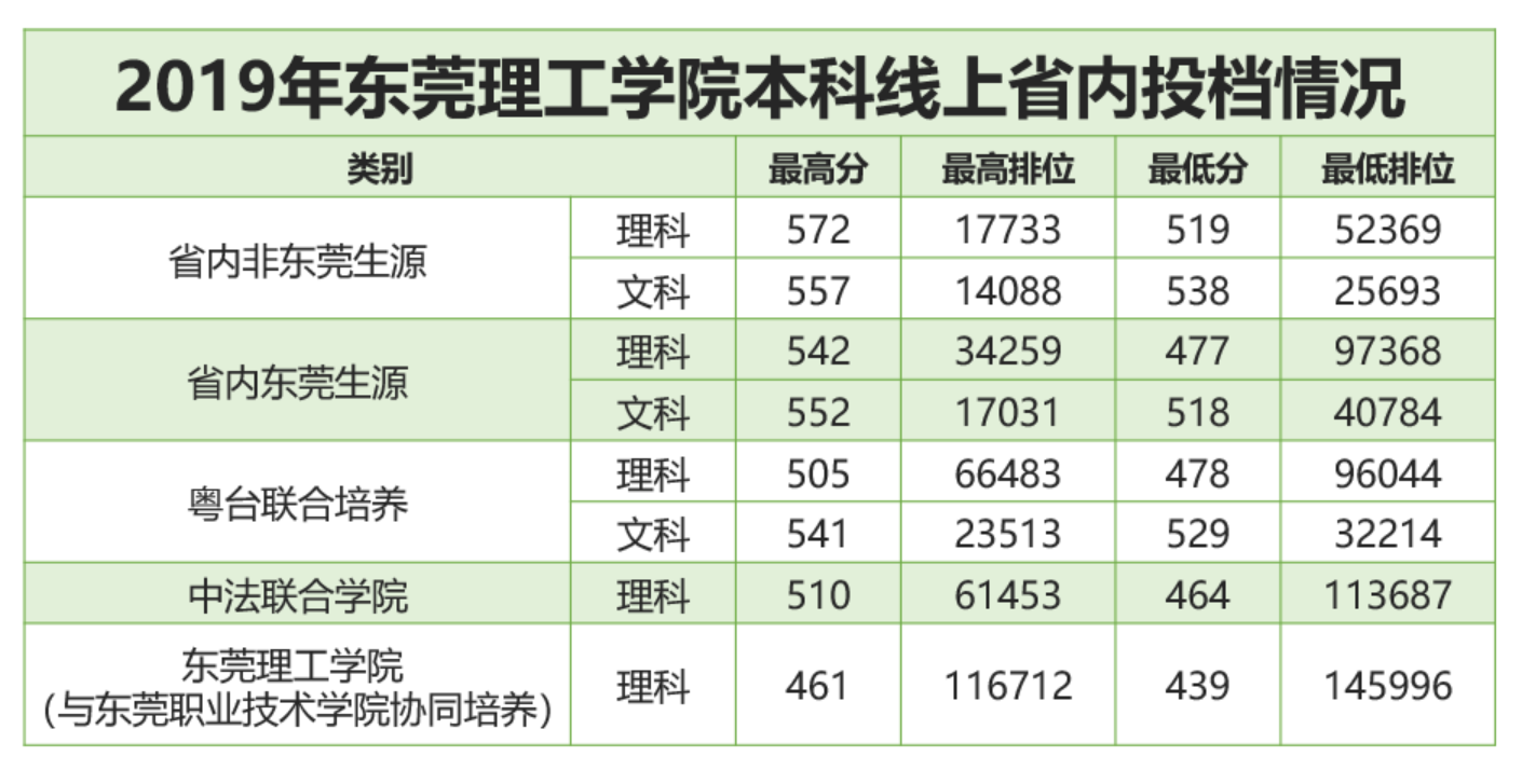 今年我校文科原计划招生988人,增加计划5人(非东莞生源增加3人,东莞生源增加2人),共计993人。近年来我校着力开展“新文科”建设,在文科建设的探索与实践方面取得显著成效,获得了社会的广泛认可。今年文科招生大热,省内非东莞生源文科最低投档线为538分,最低排位25693名,较2018年分数提高11分,排位上升4202名;东莞生源文科最低投档线为518分,最低排位40784名,较2018年分数提高9分,排位上升1152名。