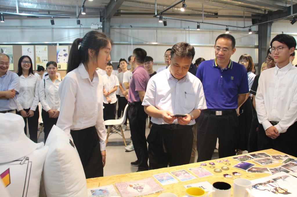 马宏伟观看了粤台产业科技学院成果展,为“粤台王洛宾艺术文创中心”揭牌,听取了师生有关展品的介绍。他充分肯定了同学们的设计思路和创新能力,表示每个专业都各具亮点,为粤台学院新工科人才培养创新实践点赞。他希望粤台学院师生再接再厉,在新工科建设、创新人才培养方式等方面解放思想、大胆尝试。