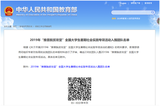 近日,从教育部网站获悉,由我校刘蕾老师和诸小妮老师共同申报的“暖风暑期社会实践服务队”,在经过层层推荐、资料审核、专家评审等程序后成功从上千支高校实践团队中脱颖而出,入围2019年“推普脱贫攻坚”全国大学生暑期社会实践专项活动。该计划广东省仅有10支队伍入选。