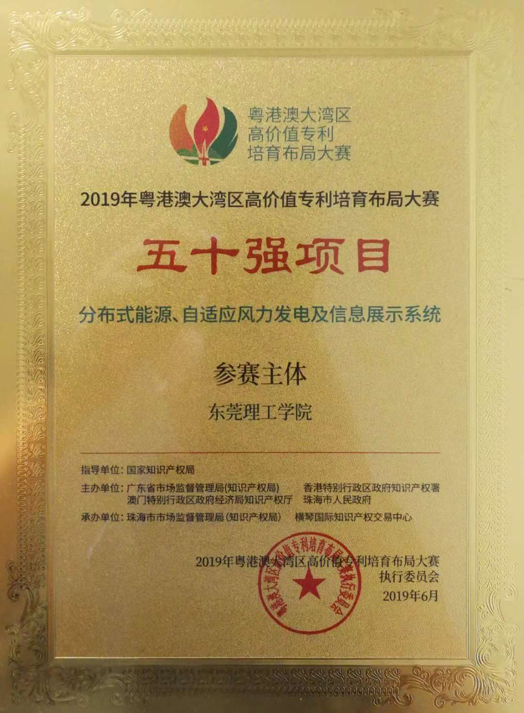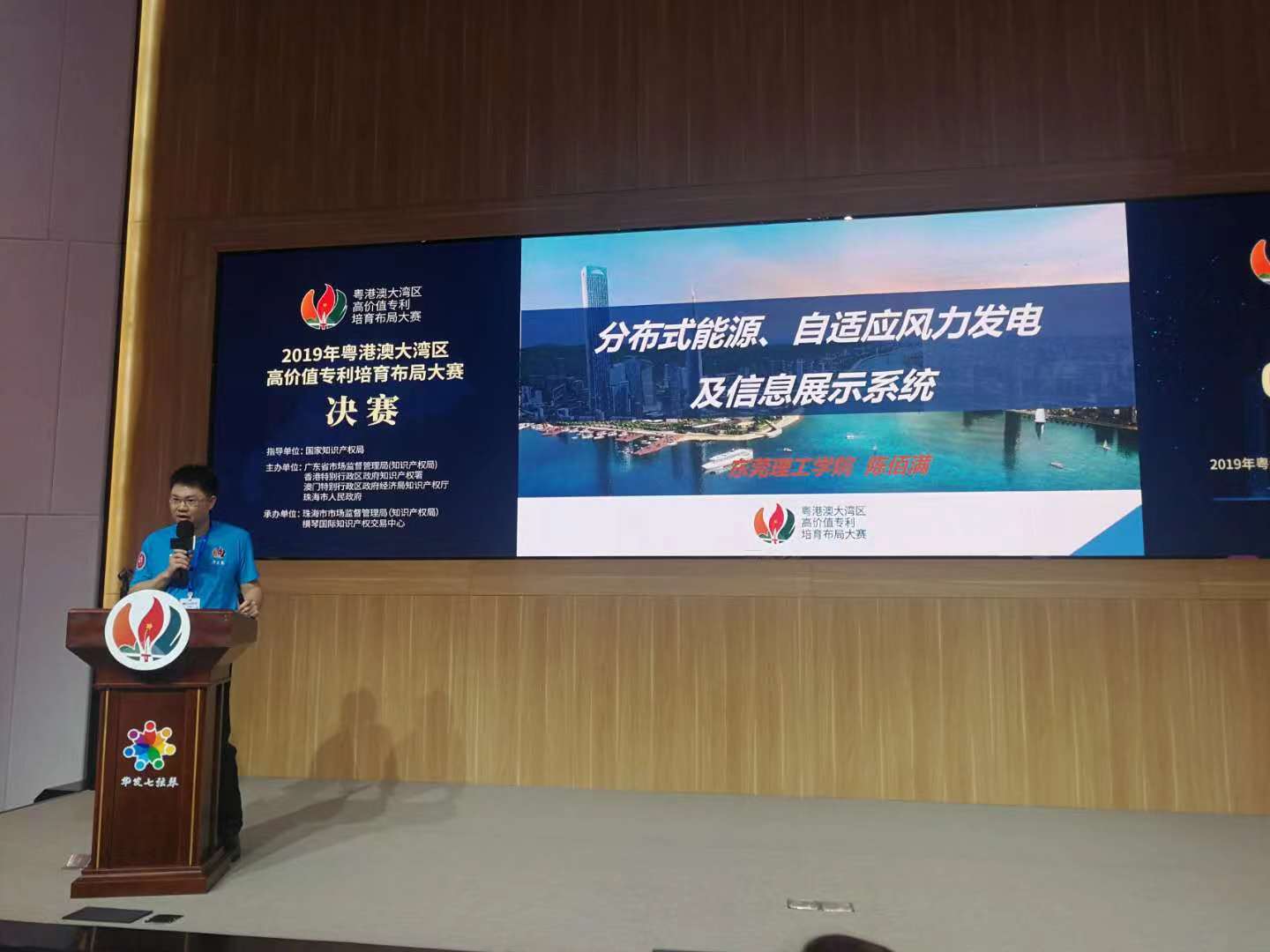 2019粤港澳大湾区高价值专利培育布局大赛(以下简称“湾高赛”)近日在广东省珠海市收官。我校陈佰满博士的项目“一种自适应型风力驱动户外全方位信息展示方法、设备及控制系统”获得了五十强奖项。