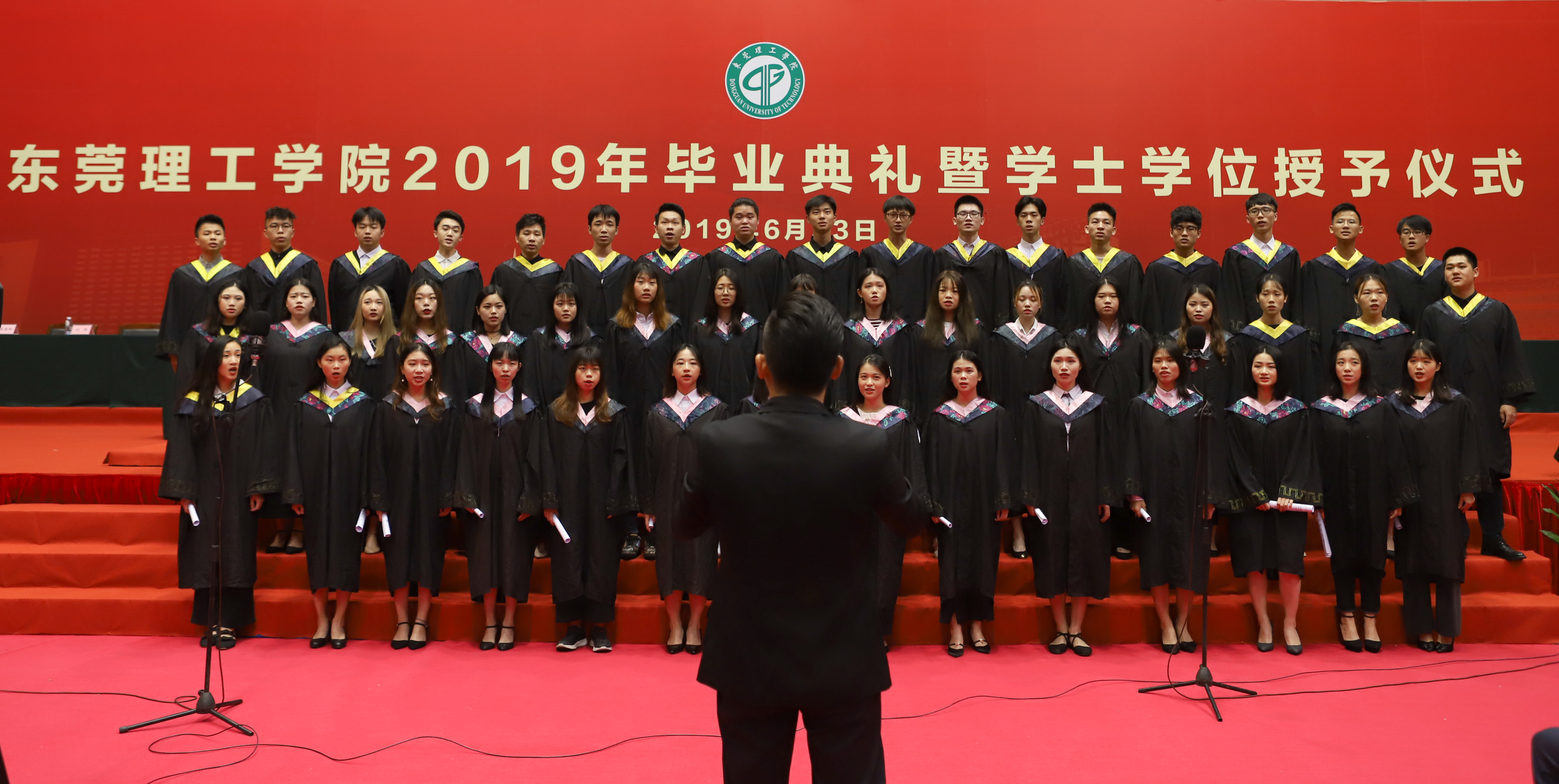 桃李满天下,恩情似海深。为了对大学四年陪伴在身边的老师表以尊敬之情感,在毕业典礼开始前,各二级学院优秀毕业生们向本学院老师代表献花敬礼。随后,莞工大学生合唱团成员身穿学士服,站到台前,为毕业典礼倾情献唱曲目《我喜欢》和《我和我的祖国》。