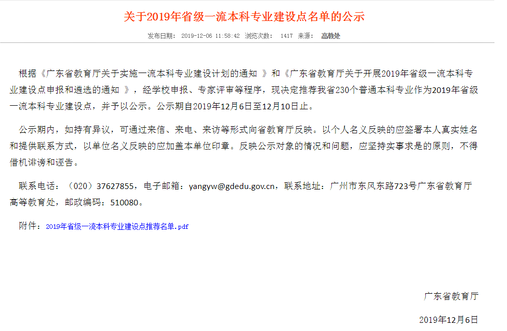 根据《教育部办公厅关于实施一流本科专业建设“双万计划”的通知》(教高厅函〔2019〕18号)和《广东省教育厅关于开展2019年省级一流本科专业建设点申报和遴选的通知》等文件精神,我校积极组织相关学院全面深入开展一流本科专业建设“双万计划”的申报工作。近日,广东省教育厅发布公示名单,我校推荐的“应用化学”等7个专业全部入选2019年广东高校一流本科专业建设点。