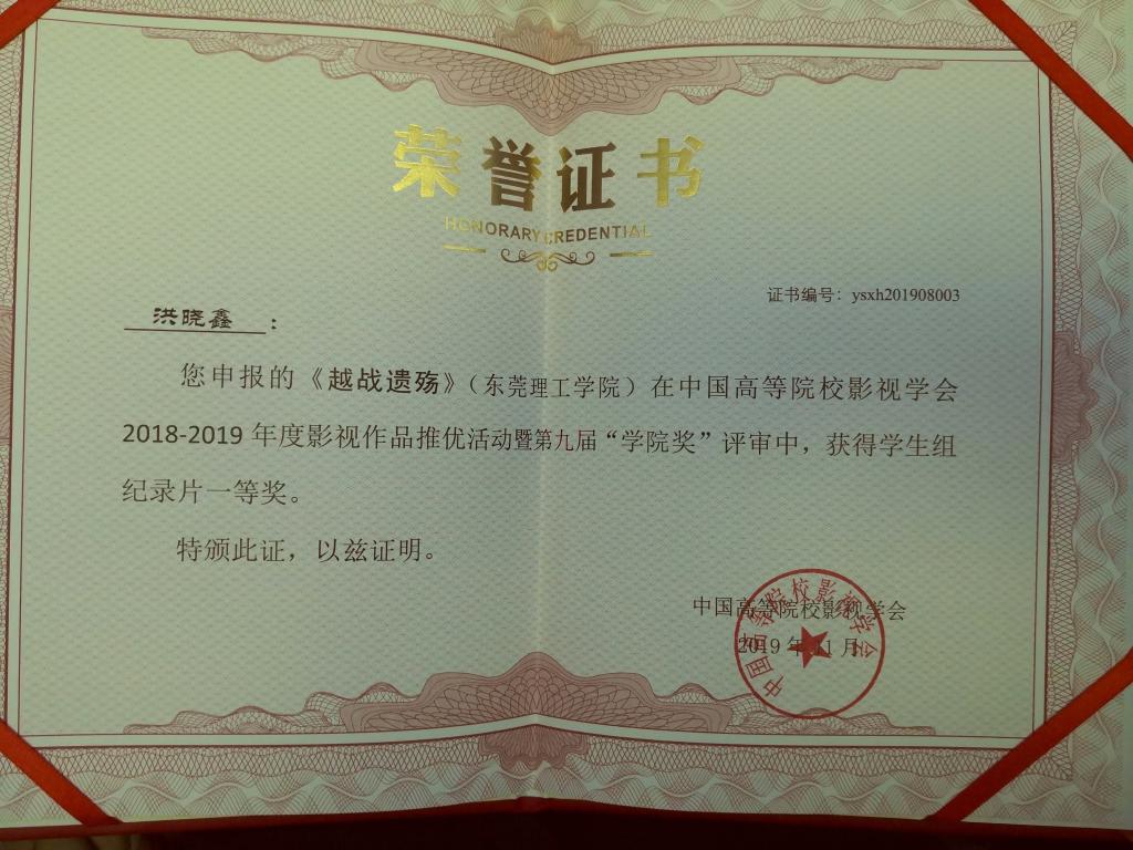 本次论坛期间,中国高等院校影视学会颁发了第十二届“学会奖”、第九届“学院奖”和第四届“学人奖”。传媒系师生作品喜获两项“学院奖”,其中洪晓鑫的纪录短片《越战遗殇》获得学生纪录片组一等奖,以指导老师张曼缔名义报送的学生毕业作品《我还在——细菌战后的溃烂人生》获得教师纪录片组三等奖。这是传媒系首次参加中国高校影视学会影视作品推优活动,成绩喜人。以上获奖作品既有课程作品又有毕业作品,获得学术界评委的肯定是对文传学院传媒系专业建设成果的认可。