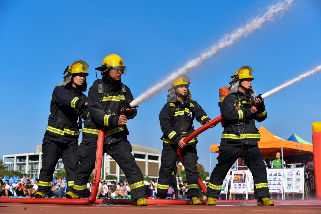 实战展示环节里,消防员行动迅速、训练有素,为参与启动仪式的各方人员系统展示了灭火的整个流程:初战快速出水控火操、枪炮协同灭火操、初期火灾演示。