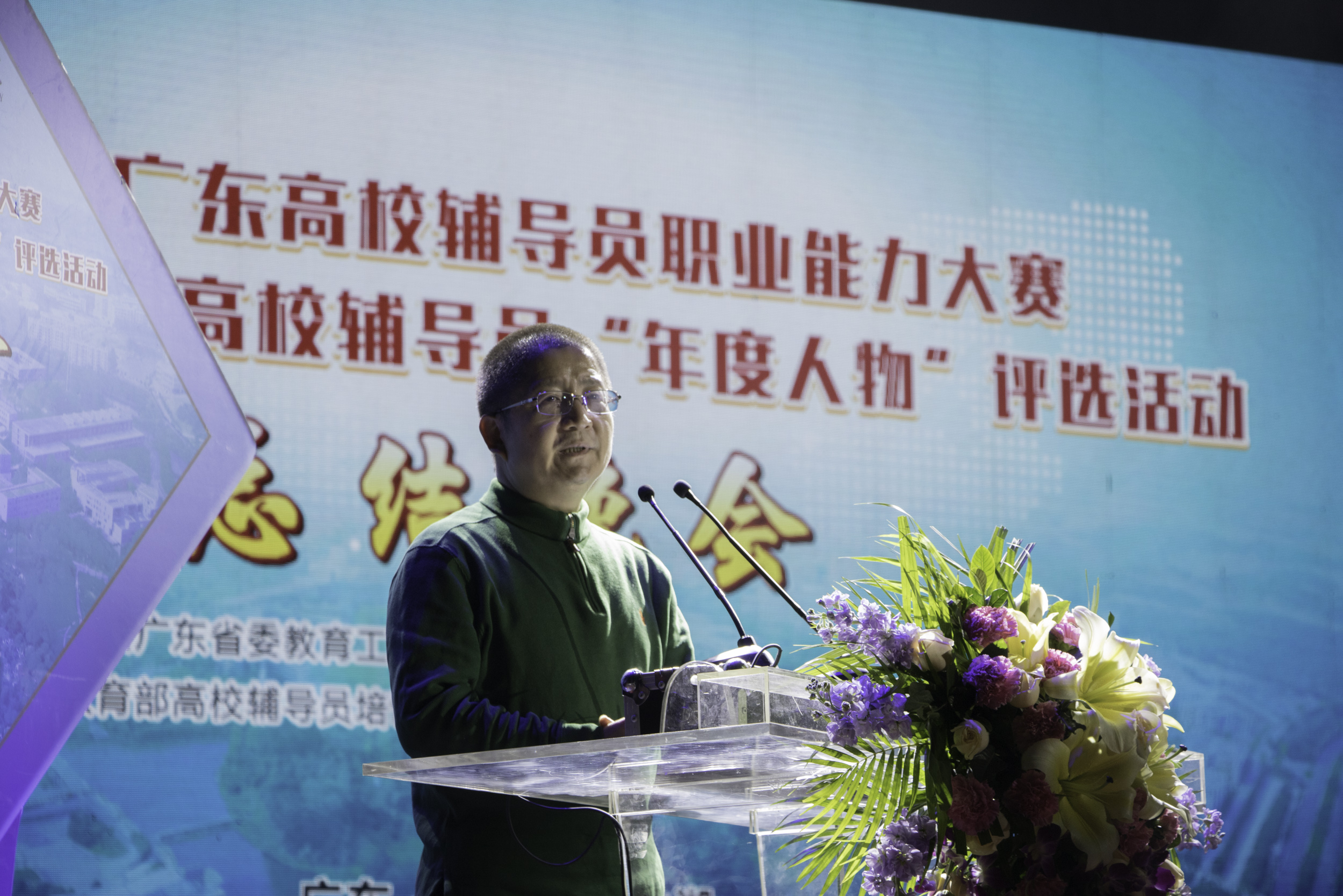 1月7日晚,第七届广东高校辅导员职业能力大赛暨2017年广东高校辅导员“年度人物”评选活动在我校大礼堂隆重举行。广东省教育厅思想政治工作与宣传处处长袁本新,我校党委书记成洪波,党委副书记吕琦元,教育部高校辅导员培训和研修基地常务副主任、华南师范大学博士生导师魏则胜,广东省高校心理健康教育与咨询委员会常务副主任梁瑞琼,广东省高校易班发展中心常务副主任余俊渠处长与大赛部分评委、专家、参赛辅导员、我校学工队伍一同参加了总结表彰晚会。