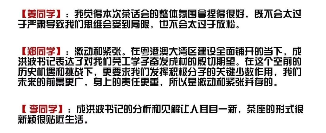 在茶座上,成洪波首先分享了自己学习习近平总书记视察广东重要讲话精神的体会和感受。他表示,要掌握习近平视察广东重要讲话的精神要义,重点在于三句话:要坚定改革开放的决心,加大改革开放的力度;要坚定迎接一切挑战的信心,世界形势错综复杂,我们要增强面对困难的勇气和信心,抓住“一带一路”以及粤港澳大湾区的建设的机遇;同时要具有办好事情的鲜明态度,知行合一,立德树人,以天下为己任,忧国忧民,要有为党为社会奉献担当的精神。