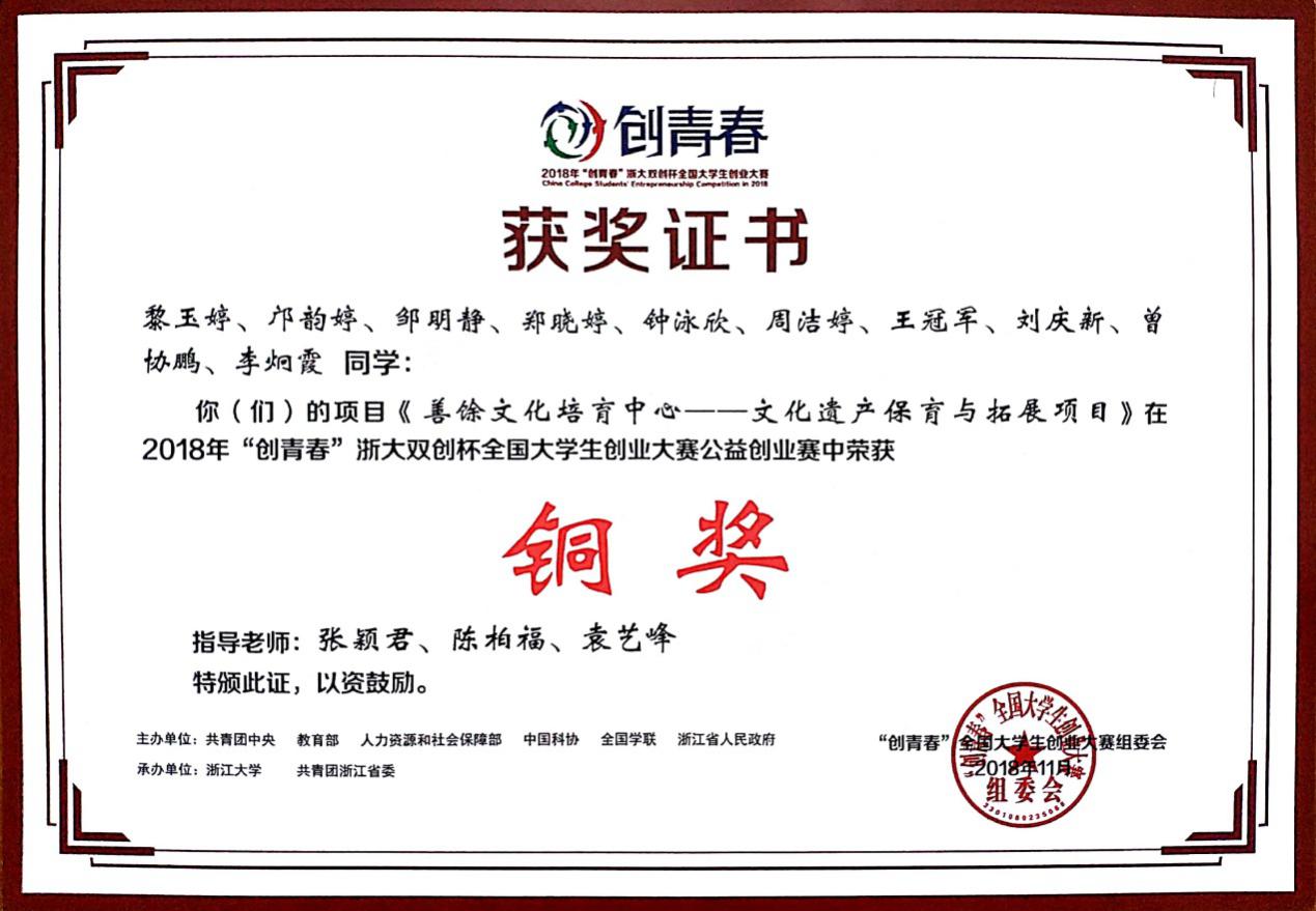 近日,2018年“创青春”浙大双创杯全国大学生创业大赛终审决赛在浙江大学举行。在本届大赛中,我校学子再续佳绩,学生创业团队的项目《东莞市智物信息科技有限公司》(主要参加者:罗志威、李志航、李国康、王倚杏、刘婉馨、苏敏华、吴浩凯、袁许银、李秋坤、丁少婷,指导老师:卫红权、张钢、杨帆)、《善馀文化培育中心——文化遗产保育与拓展项目》(主要参加者:黎玉婷、邝韵婷、邹明静、郑晓婷、钟泳欣、周洁婷、王冠军、刘庆新、曾协鹏、李炯霞,指导老师:张颖君、陈柏福、袁艺峰)分别在创业实践挑战赛和公益创业赛中荣获铜奖。