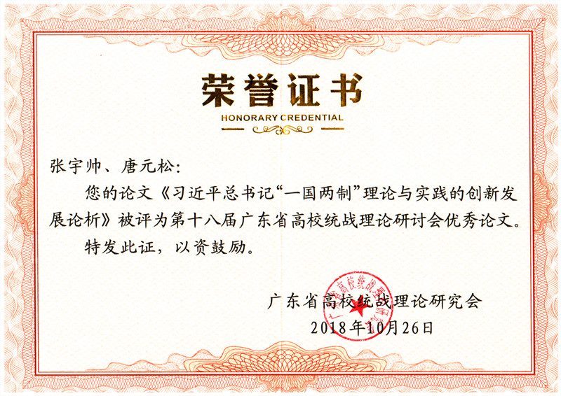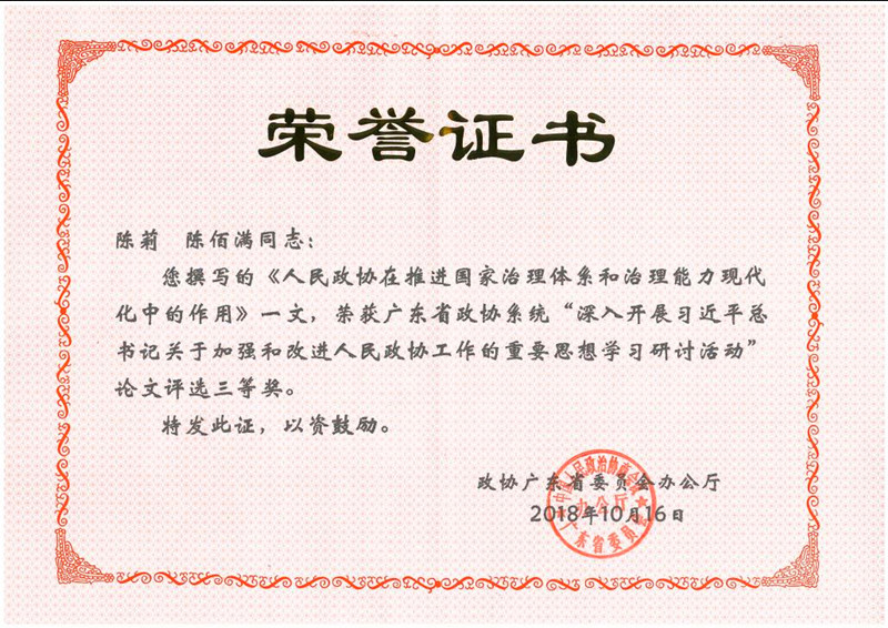 近日,我校盟员陈莉、陈佰满撰写的论文《人民政协在推进国家治理体系和治理能力现代化中的作用》荣获广东省政协系统“深入开展习近平总书记关于加强和改进人民政协工作的重要思想学习研讨活动”论文评选三等奖;马克思主义学院张宇帅、唐元松撰写的论文《习近平总书记“一国两制”理论与实践的创新发展论析》被评为第十八届广东省高校统战理论研讨会优秀论文。