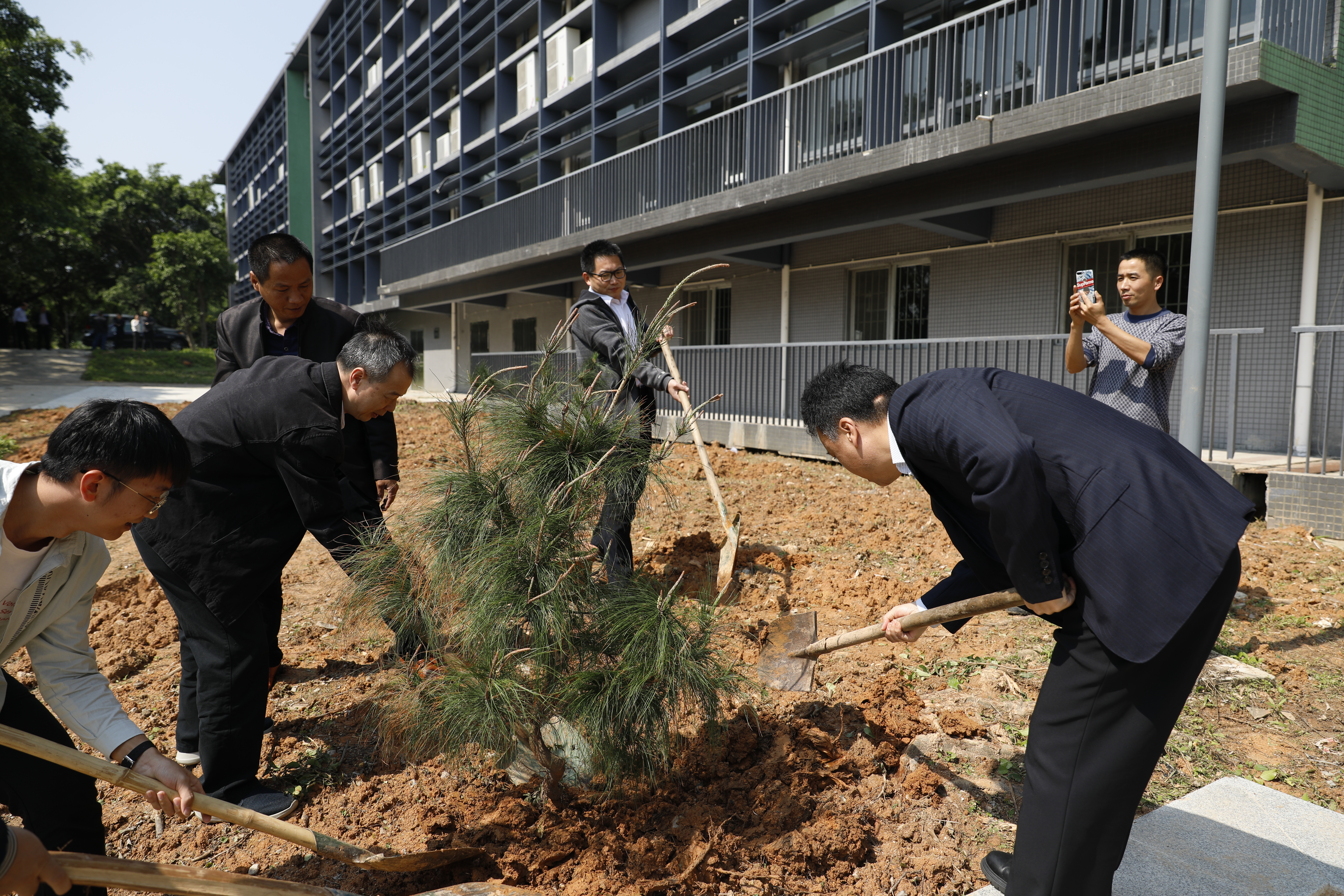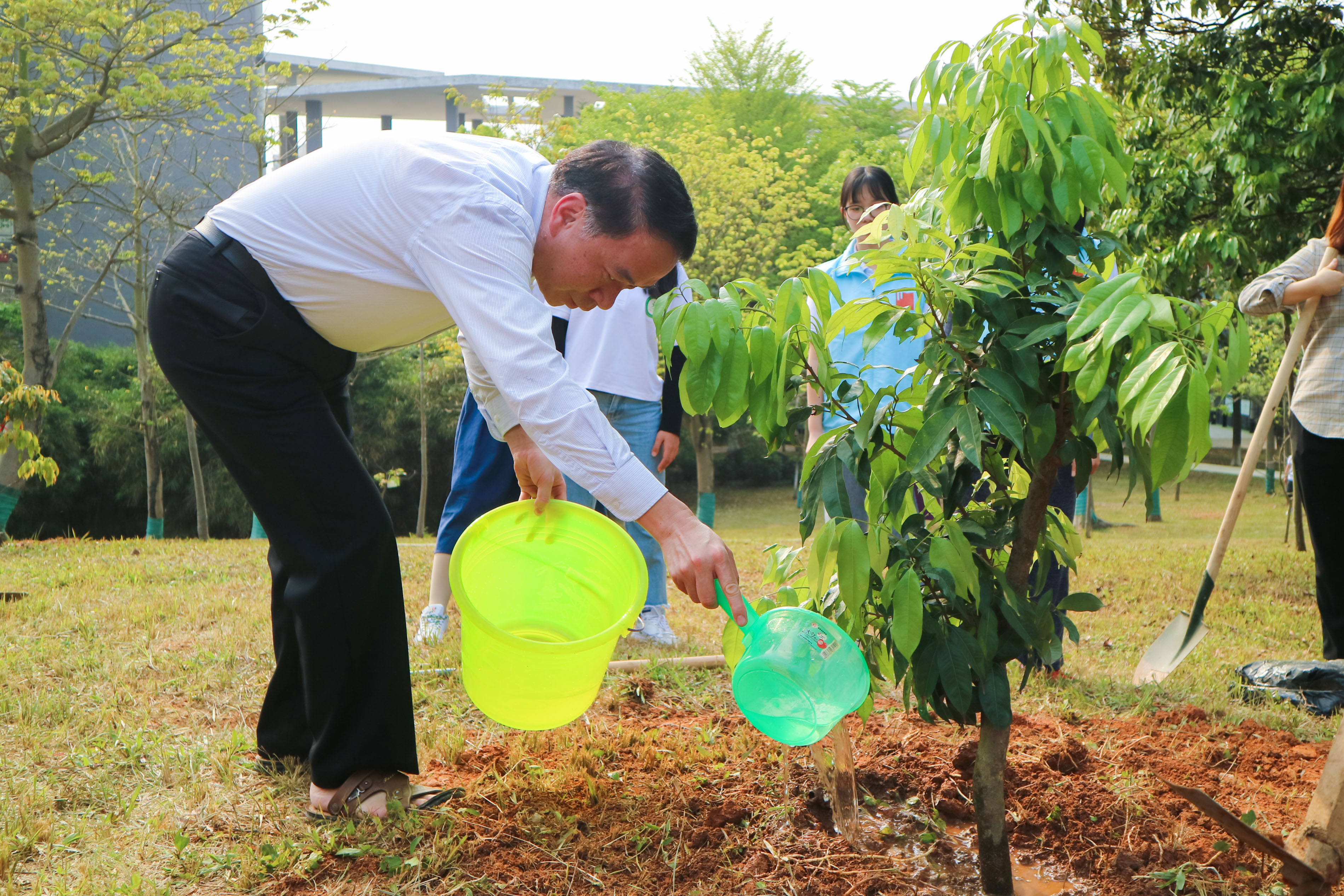 李琳扛起锄头带头铲土挖坑,为同学们示范栽树技巧。他一边向同学们简要讲解了植树的相关知识,一边与同学们挖坑、培土、浇水。在师生的共同努力下,2株树苗得以落地生根。